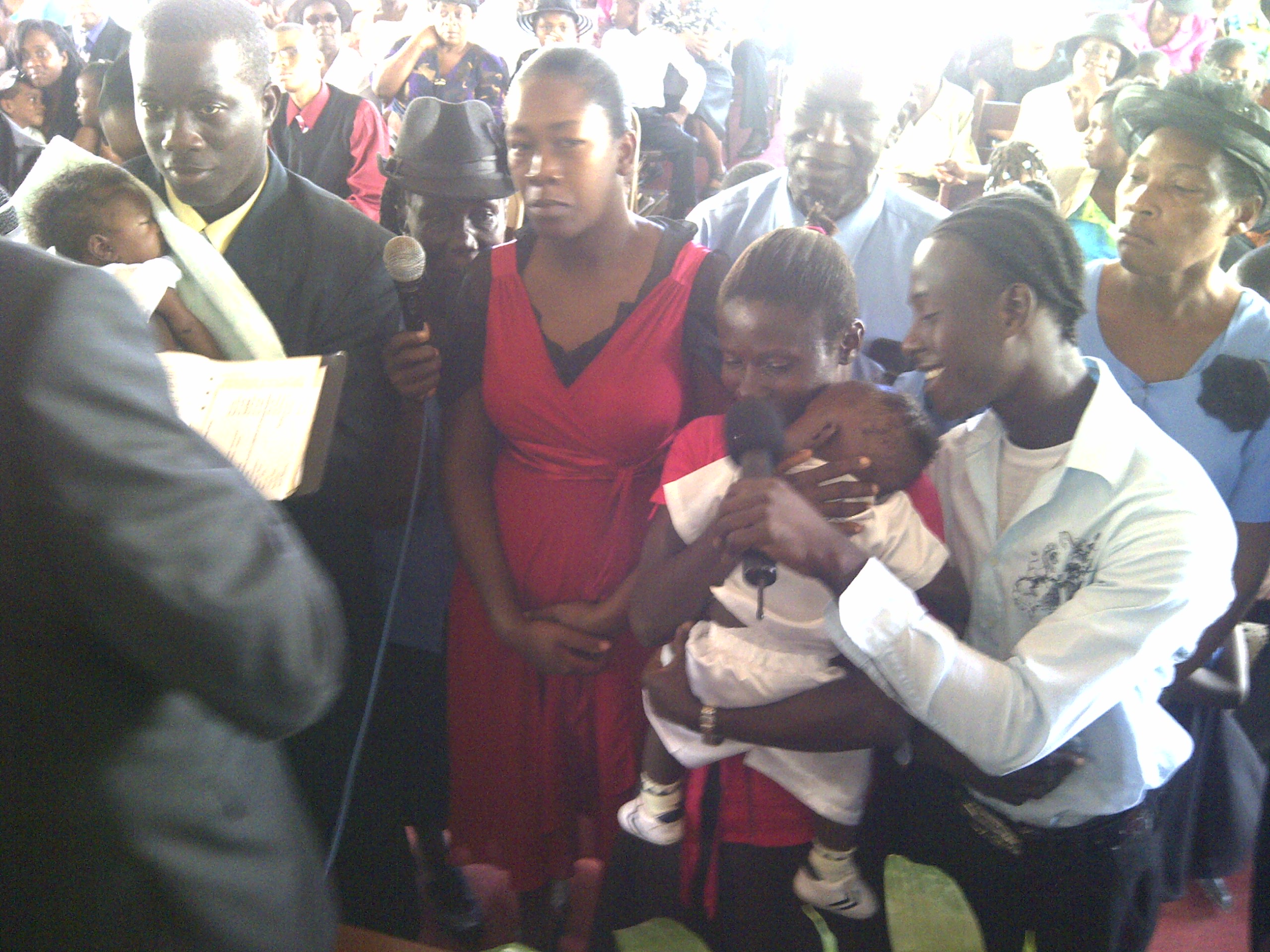 A happy couple from the community and even a more joyous father smiles as they both affirm their love and pledge to support their newborn child.