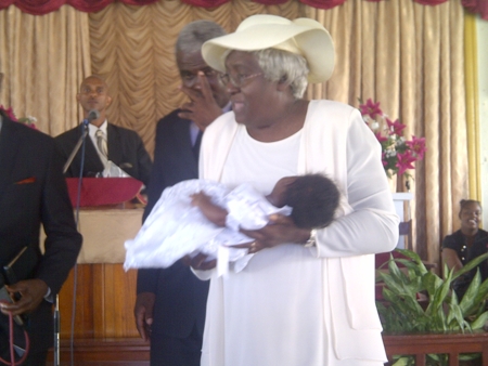 Elder Folks Sabbath School head superintendent, receives little baby Edman on behalf of the church.
